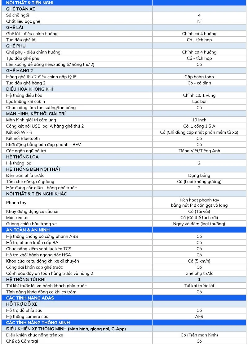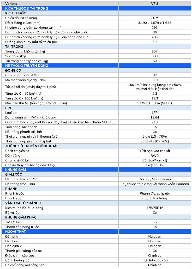 THÔNG SỐ KỸ THUẬT VINFAST VF3