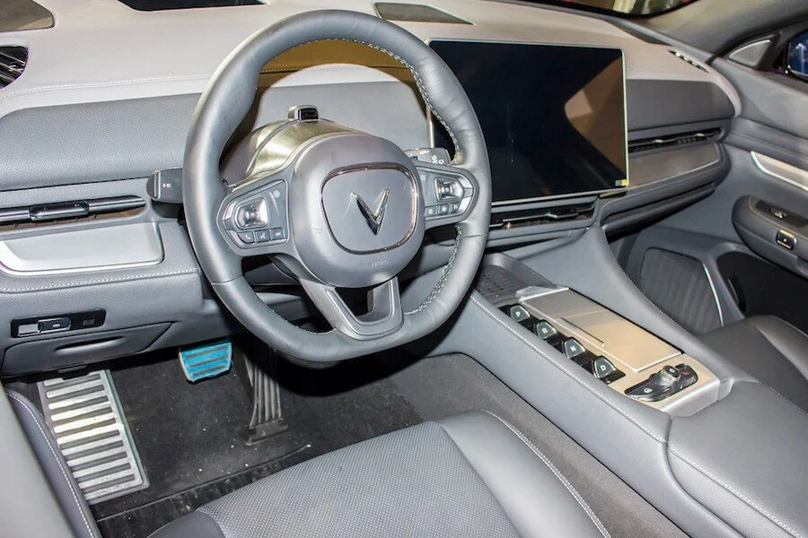 VinFast VF9 rất dễ khiến khách hàng liên tưởng đến những mẫu xe điện Tesla khi không có bảng đồng hồ phía sau vô lăng.